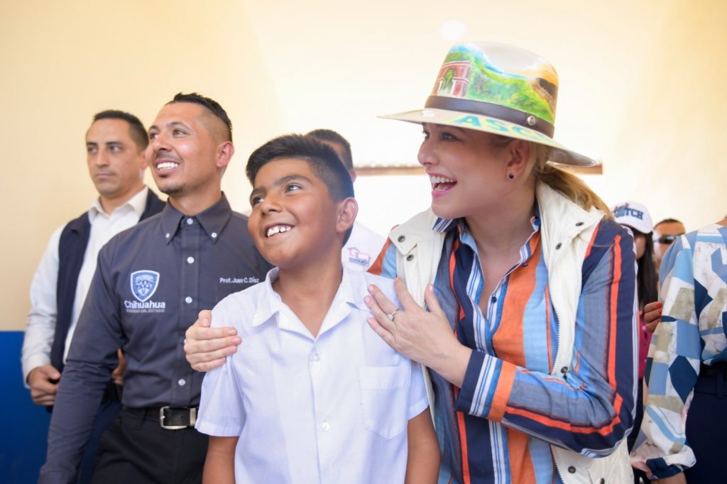 Con una “cascarita” inauguró una cancha de futbol en la escuela Porfirio Talamantes, de Janos, donde entregó mobiliario para otros 10 planteles