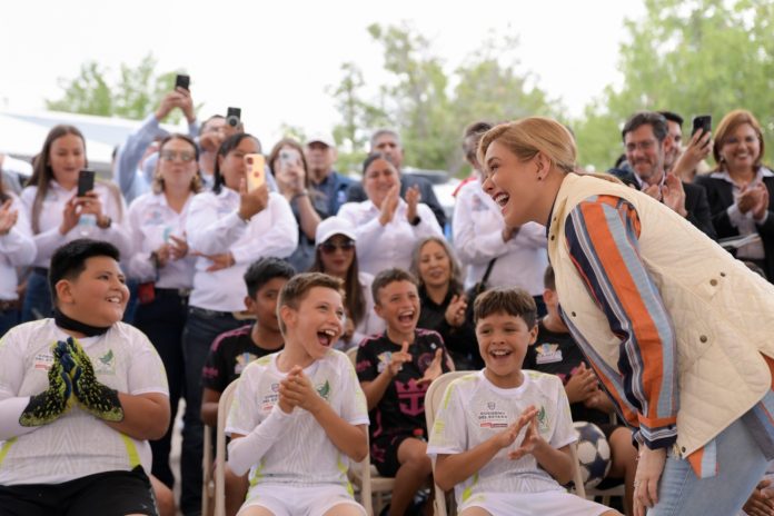 En Janos, con una “cascarita” la mandataria inauguró una cancha de futbol 7×7 con pasto sintético en la escuela Porfirio Talamantes, donde además distribuyó mobiliario educativo para otros 10 planteles, como butacas, pizarrones, aires, tinacos y luminarias.