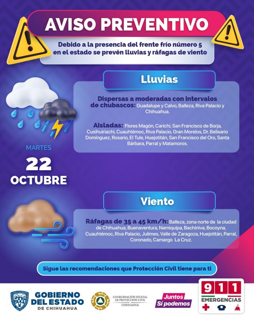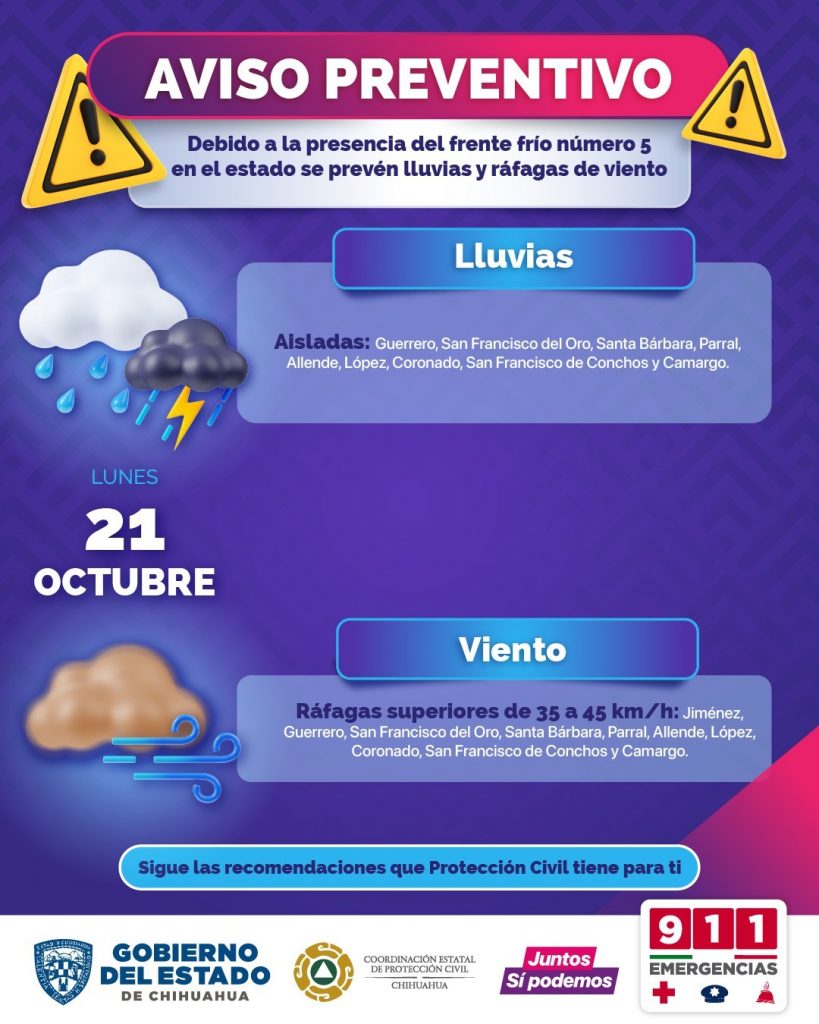 Para este lunes 21 de octubre las rachas de viento se esperan moderadas, de 35 a 45 kilómetros por hora. Además, en localidades como Guerrero, San Francisco del Oro, Santa Bárbara, Parral, Allende, López, Coronado, San Francisco de Conchos y Camargo, existe el pronóstico de lluvias aisladas.
