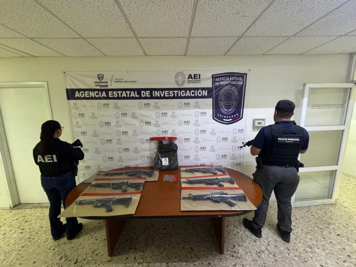 Derivado de los avances de las investigaciones de los recientes homicidios cometidos en la ciudad de Chihuahua, en un operativo policial coordinado, fueron aseguradas armas de fuego largas y equipo táctico en el fraccionamiento Castilla Reliz.