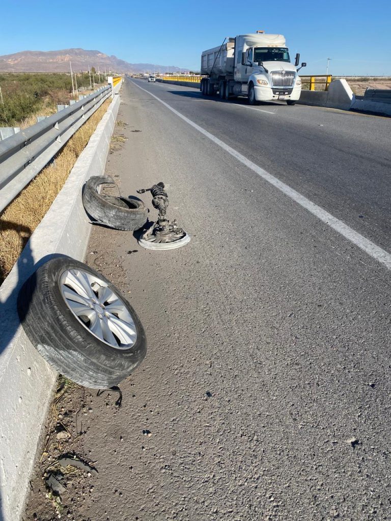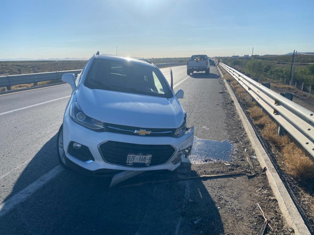 Meoqui. – Esta mañana de martes se presento un accidente donde la conductora de un vehículo perdió el control al reventar un neumático y término golpeandolo con el muro de contención esto sobre el kilómetro 171 de sur a norte carretera meoqui a Chihuahua dejando múltiples daños materiales de consideración en la camioneta marca Chevrolet trax en color blanco de modelo reciente placas DZF 168-B del estado de Chihuahua.