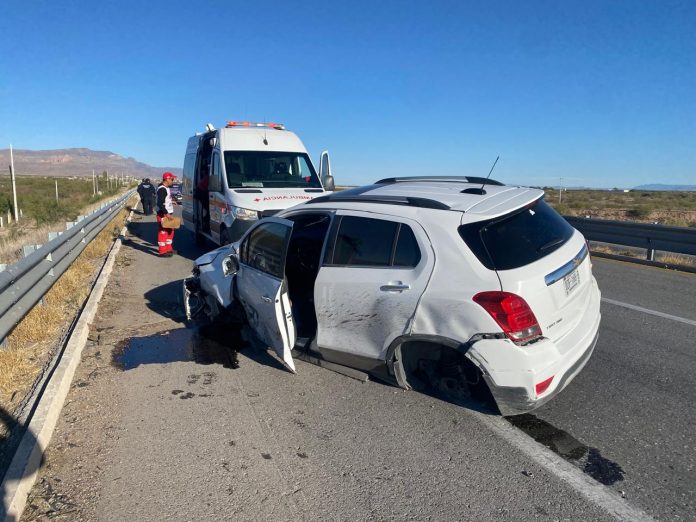 Meoqui. – Esta mañana de martes se presento un accidente donde la conductora de un vehículo perdió el control al reventar un neumático y término golpeandolo con el muro de contención esto sobre el kilómetro 171 de sur a norte carretera meoqui a Chihuahua dejando múltiples daños materiales de consideración en la camioneta marca Chevrolet trax en color blanco de modelo reciente placas DZF 168-B del estado de Chihuahua.