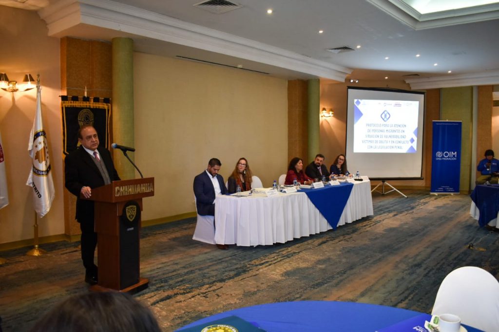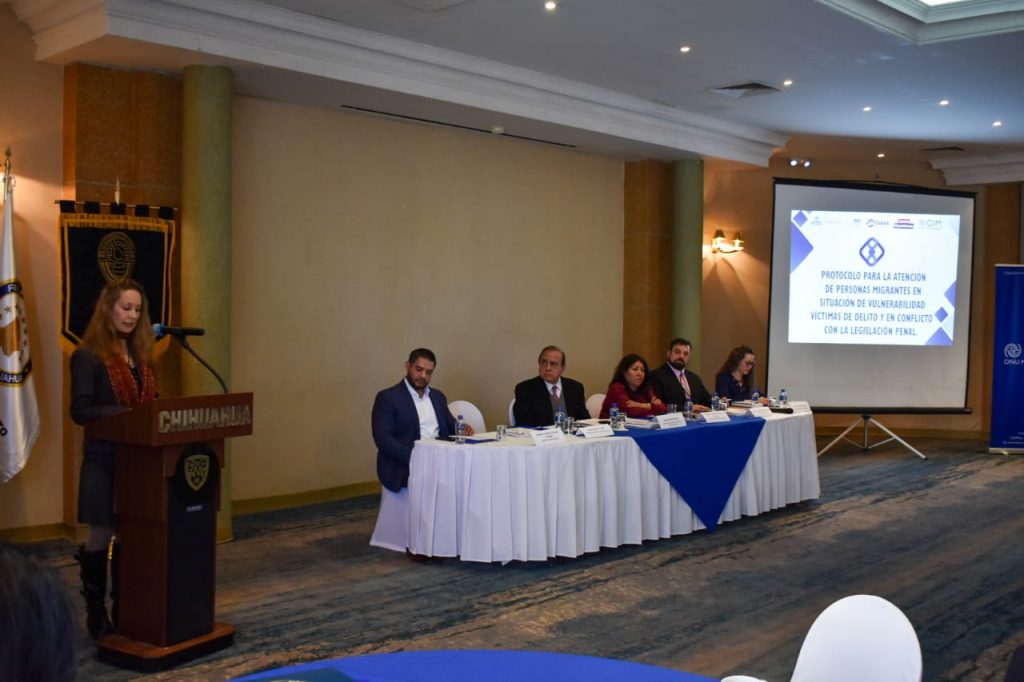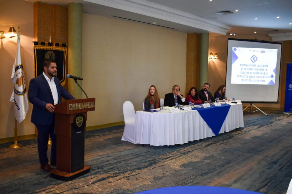 La Fiscalía General del Estado de Chihuahua, junto con la Organización Internacional para las Migraciones (OIM/ONU Migración), presentaron hoy el “Protocolo para la atención de personas migrantes en situación de vulnerabilidad víctimas de delito y en conflicto con la legislación penal”, ante aproximadamente 150 servidores públicos.