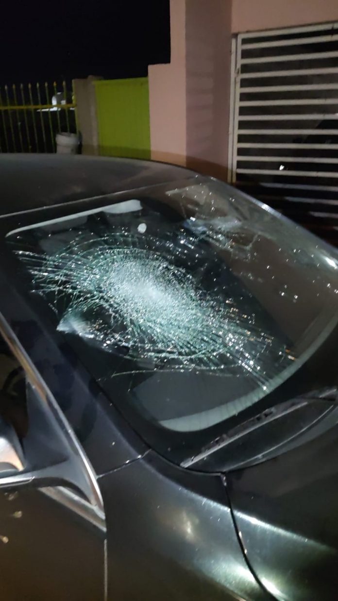 La señora manifestó que mientras estaba en llamada con su hija, escuchó gritos y observó a varias personas golpeando con una tabla el vehículo de su hijo, un Chevrolet Malibú color negro sin placas de circulación, el cual se encontraba estacionado fuera de su domicilio. Además, notó que uno de los individuos portaba un arma, la cual apuntó hacia su vivienda.
