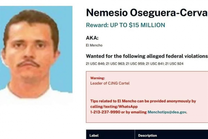 El Departamento de Estado de Estados Unidos elevó a 15 millones de dólares la recompensa para aquella persona que provea datos que lleven a la captura del presunto máximo líder del Cártel Jalisco Nueva Generación (CJNG), Nemesio “El Mencho” Oseguera Cervantes.