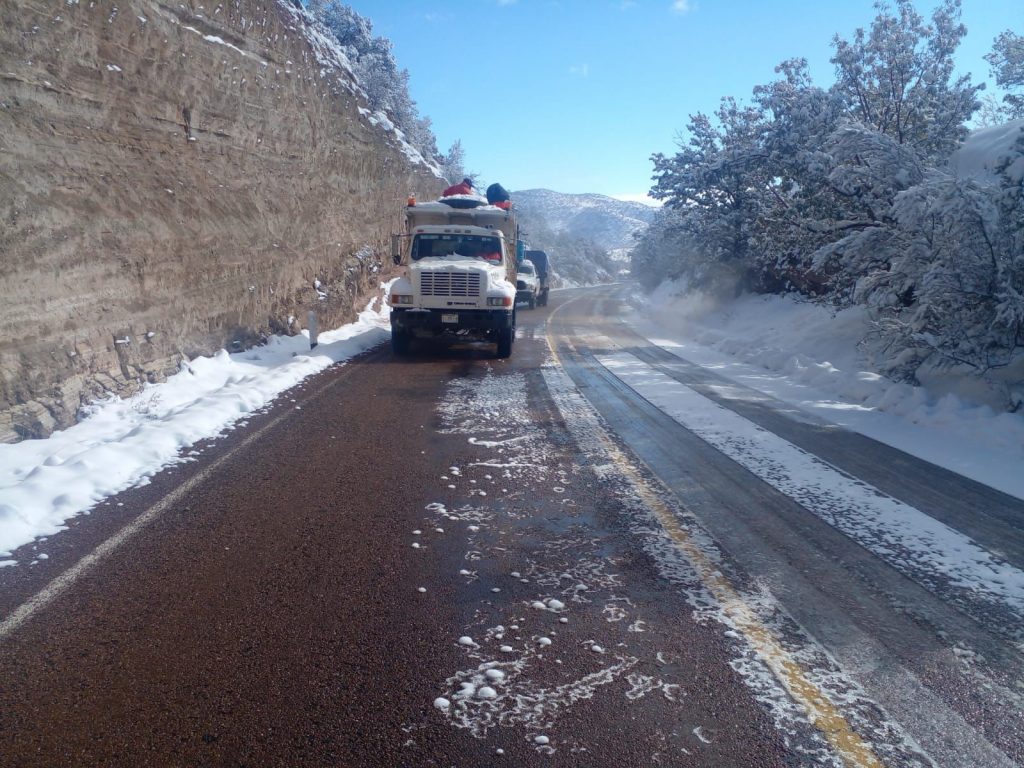 En colaboración con la Coordinación Estatal de Protección Civil, se reforzaron los trabajos de remoción de nieve y aplicación de sal en tramos clave para garantizar condiciones seguras.